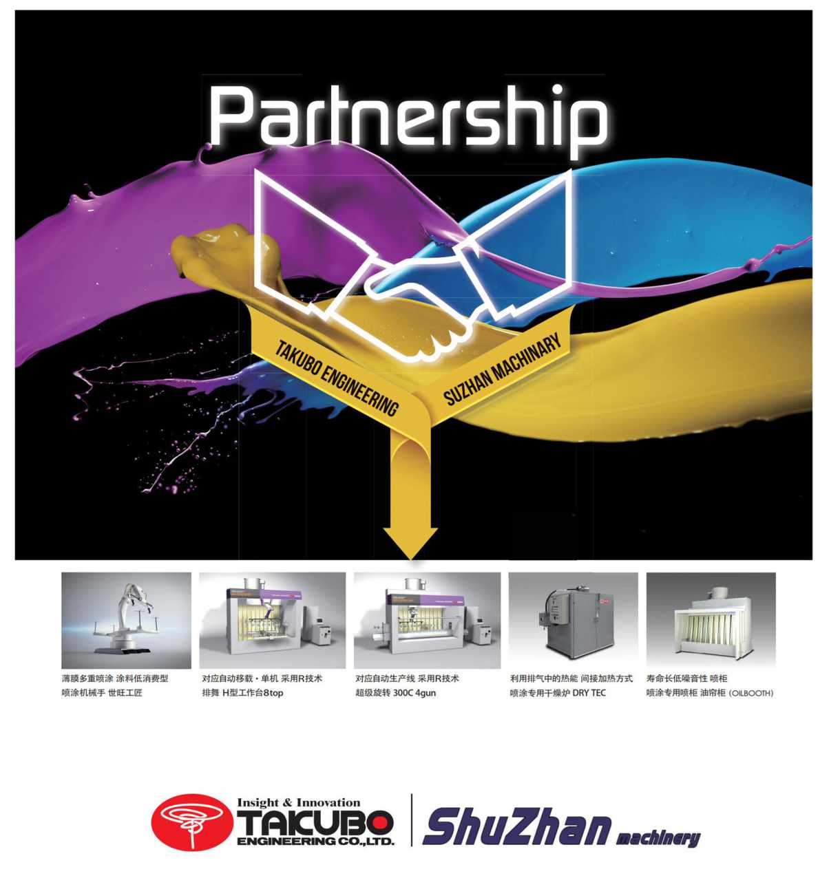 日本泰酷寶工程株式會社成立于1975年,作為代表日本噴涂系統的廠商,產品不僅供應給日本國內企業,還遠銷到中國,韓國,歐美等世界各地。尤其是機械手噴涂系統“SOFTBOY PRO”,采用了與東芝機械共同開發的懸吊式平行移動機械手技術。主力產品SOFTBOY PRO的噴涂設備得到業界的肯定。2016年舒展機械與日本泰酷寶正式達成戰略合作,共同致力于研發高品質,低成本,重環保的涂裝系統。為改善涂裝環境,我們正在從效率和性能等方面全面綜合地考慮設備的安裝場地、涂料能源消耗量、環境問題、成本等與涂裝密切相關的因素,進行系統的設計、產品的開發。近年來已共同在蘇州、南通、上海等地區為客戶提供了安心并貢獻利益的產品。不僅提高涂裝效率、還使涂裝作業對產品、人、地域環境的影響降低到最小,同時實現了高品質產品的量產化、能源的充分有效利用、成本的降低。名副其實的〔實用〕、〔可信賴〕涂裝機械手、技術尖端的捕集系統、高安全性的干燥爐系統、以及凈化系統……。