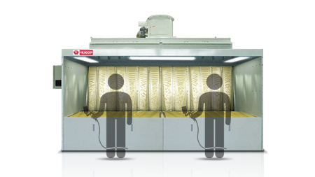 有2位工作人員同時噴涂的空間,適用于手噴油簾柜。低噪音設計,油簾柜前可以說話,很安靜的油簾柜。全面縱向導流板的2層結構,利用流在導流板的油,捕捉過噴漆霧。